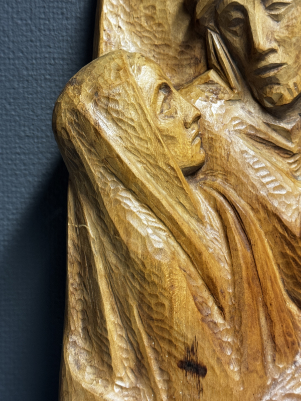 U ziet Jezus met de doornenkroon en kruis op de schouder, terwijl Maria Hem vol verdriet aankijkt. De expressie is sober en krachtig, met duidelijke sporen van handwerk in de beitelstructuur.
