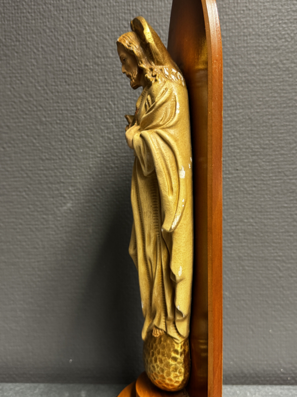 De figuur is gemonteerd op een gepolijst houten paneel met gotische spitsboogvorm, wat het beeld een sobere maar statige uitstraling geeft. Jezus staat op een vergulde wereldbol, wat verwijst naar zijn heerschappij over de aarde. De zachte kleuren – goud, crème en oker – zorgen voor een warme, serene uitstraling.