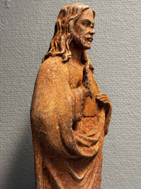 OverzichtDit indrukwekkende gietijzeren beeld van het Heilig Hart van Jezus straalt kracht en devotie uit. Het beeld toont Christus met opgeheven hand in zegenende houding, met het Heilig Hart zichtbaar op zijn borst – een symbool van liefde, barmhartigheid en toewijding. De roestbruine patina geeft het beeld een authentiek karakter, waardoor het een tijdloze, bijna monumentale uitstraling heeft.