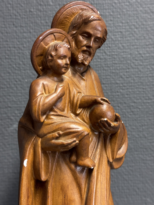 Het beeld toont Jozef in een rustige, beschermende houding terwijl hij het Kind Jezus op de arm draagt. De vloeiende plooien van zijn gewaad en de zachte expressie van de gezichten weerspiegelen zowel ambachtelijk meesterschap als diep geloof. De houtkleurige afwerking geeft het beeld een natuurlijke, warme uitstraling die harmonieus past in zowel moderne als klassieke interieurs.