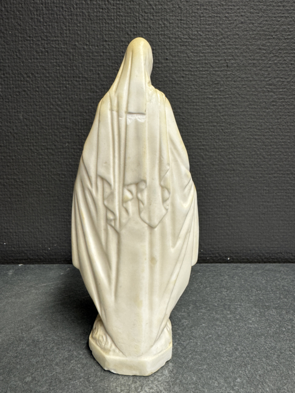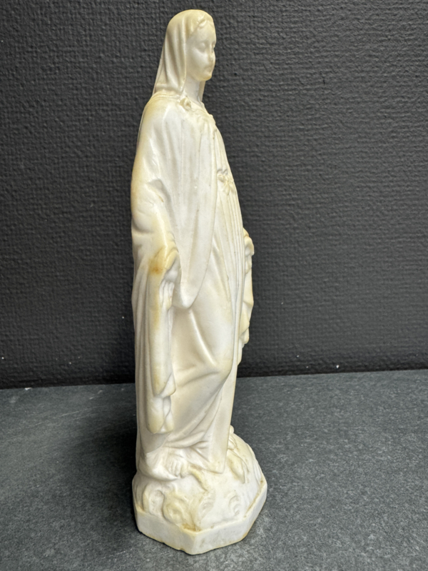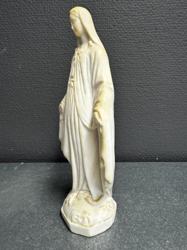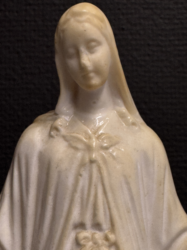 De plooien van het gewaad zijn zorgvuldig uitgewerkt en het gelaat straalt rust en barmhartigheid uit. De lichte verkleuring van het materiaal getuigt van natuurlijke veroudering en versterkt het authentieke karakter van dit devotionele object. Dit type Miraculeuze Maria werd veel geplaatst in katholieke gezinnen als teken van bescherming en vertrouwen.